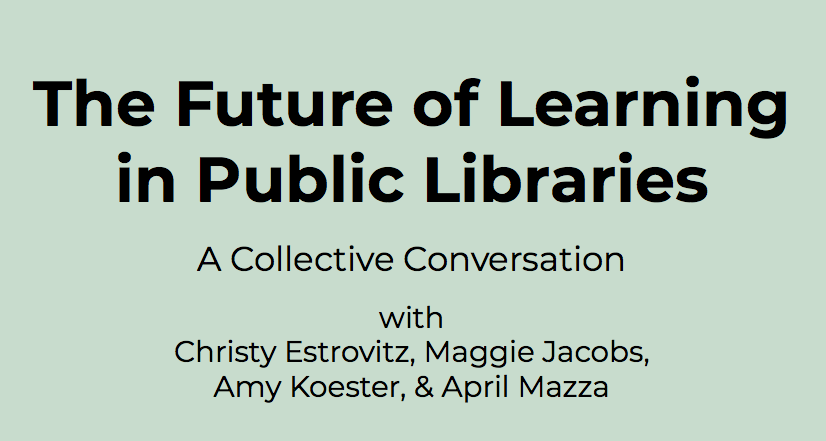 Libraries are using this juncture as an opportunity to assert ourselves as spaces for other valuable community resources, too: as hubs of democracy, as community hubs, and as learning centers, among other supplemental brandings. At ALA Midwinter’s Symposium on the Future of Libraries last weekend, I convened a panel of four librarians who, in our varied roles within varied institutions, have been thinking specifically about that role of libraries as learning centers. We shared what we’ve been thinking about learning in the public library. Today I’m sharing my perspective from my vantage point at my library.