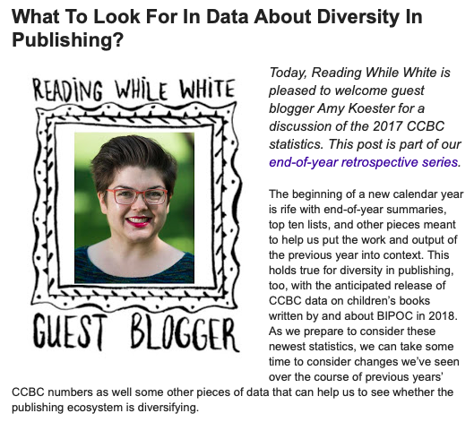 Today I've got a guest post on the Reading While White blog, where I'm talking about what types of things librarians, publishing industry folks, and anyone interested in diversity in books for youth might consider when diving into the increasing number of data sets we have relevant to the topic of diversity in children's publishing. Take a look!